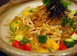 7. ゆでたうどんを器に盛り、ゆでた牛肉を載せ、(5)を上から注ぎ、ねぎを飾って出来上がり。 |