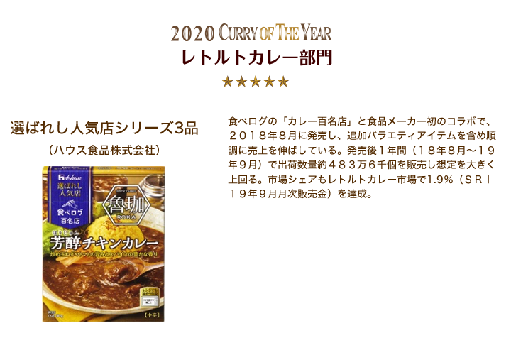 • レトルトカレー部門 選ばれし人気店シリーズ3品 (ハウス食品株式会社)