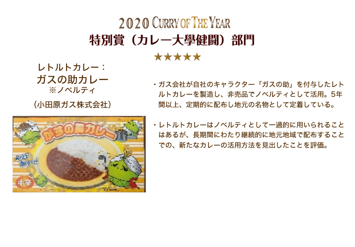 • 特別賞(カレー大學健闘)部門~カレー大學卒業生で1年間のカレー活動で成果を上げた企業及び商品~レトルトカレー:ガスの助カレー ※ノベルティ(小田原ガス株式会社)カレールウ:グルテンフリー米粉カレー(増田製粉株式会社)