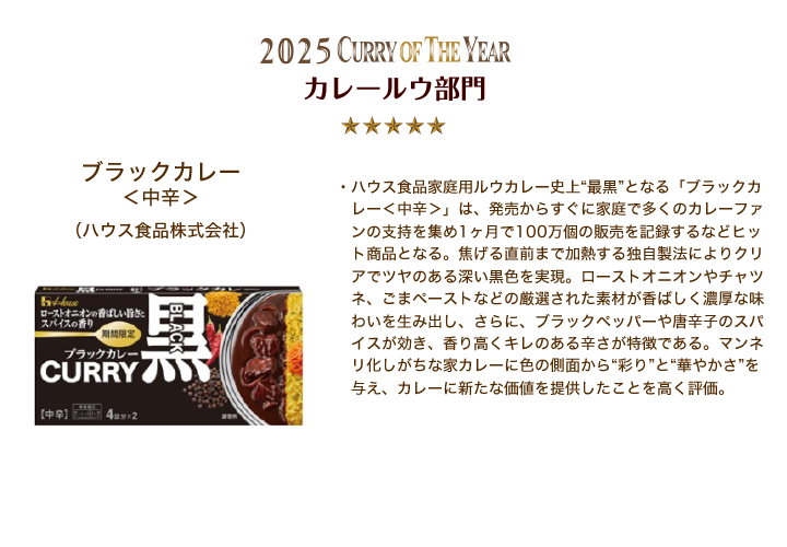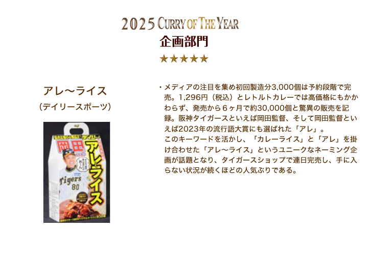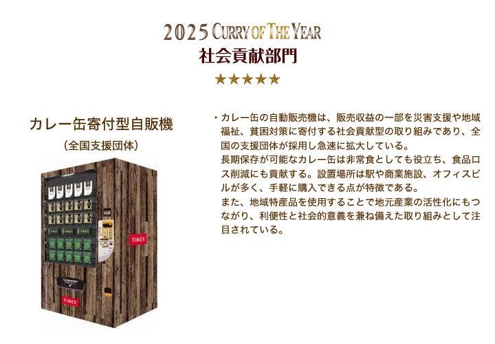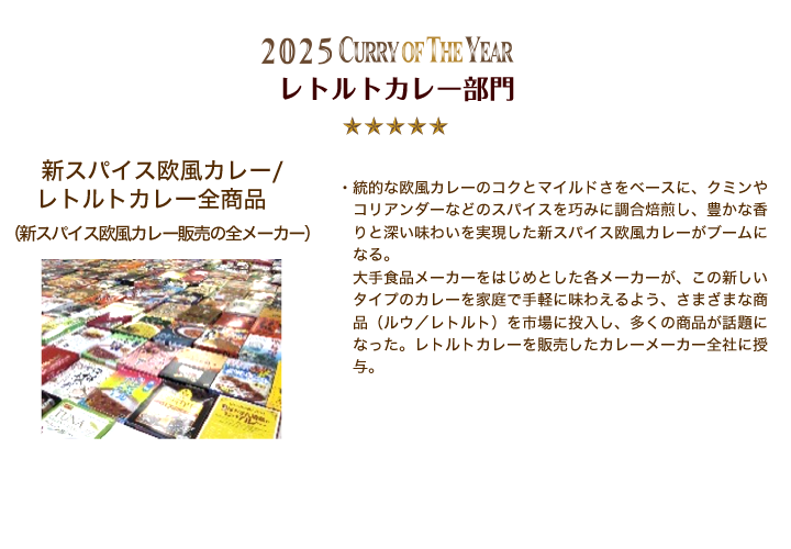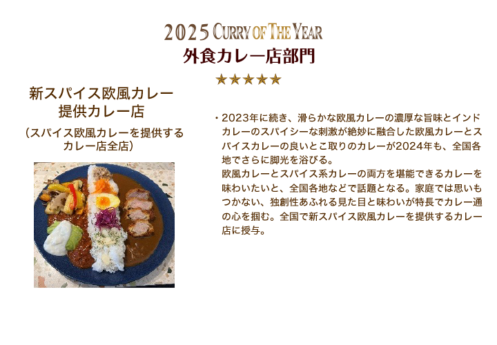 革新的もしくは、画期的なカレーであるが、まだ世間的に十分知られていない名品に授与します。具体的には、いずれかの要件を満たすそのものです。 メディアやネットなどで話題、注目を集めたカレー カレー業界に画期的な技術革新をもたらしたカレー 一部にしか知られていないが、カレー愛好者に知らしめる価値のあるカレー 日本のカレー文化の発展に寄与すると思われるカレー メディアやネットなどで話題、注目を集めたカレー カレー業界に画期的な技術革新をもたらしたカレー 一部にしか知られていないが、カレー愛好者に知らしめる価値のあるカレー 日本のカレー文化の発展に寄与すると思われるカレー 選考方法[第一次選考]日本全国のカレー大學卒業生より推薦 [第二次選考]カレー・オブ・ザ・イヤー事務局にて書類選考 [第三次選考]カレー・オブ・ザ・イヤー選考委員会にて最終決定">